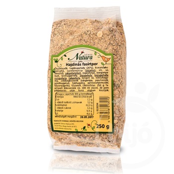 NATURA FASIRTPOR HAJDINÁS Összetevők: szójagranulátum,étkezési keményítő, zsemlemorzsa, (búzaliszt, víz,só, élesztő). Hajdinapehely (8%) napraforgó, Burgonyaliszt, lenpehely, árpa, -búza, -rozs, és zabpehely, tengeri só, fűszerpaprika, Natura ételízesítő, mely nem tartalmaz ízfokozót (nátrium-glutamát). Elkészítése: kb. 300 ml vízzel elkeverve 30 perc pihentetés után kis pogácsákat formálva forró olajban kisütjük.
